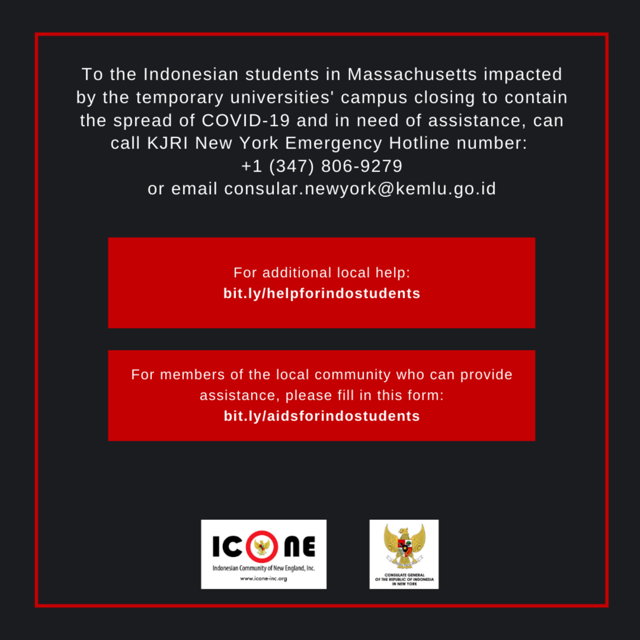 - Provided community assistance during COVID-19 through masks distribution and temporary storage for the displaced Indonesian students in collaboration with KJRI New York and Permias MA.