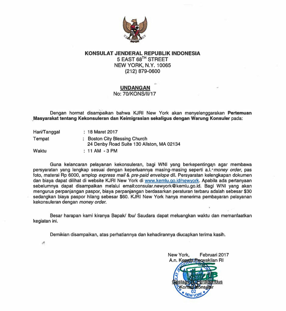 Punya pertanyaan terkait dgn kebijakan Presiden Amerika yg baru ttng keimigrasian dan travel ban? Membutuhkan layanan kekonsuleran? Atau penasaran mengenai perkembangan terbaru keimigrasian yg menyangkut WNI? Silahkan datang ke acara pertemuan masyarakat Indonesia utk info session dan tanya jawab dgn Konsul Jenderal RI New York, Bapak Abdul Kadir Jailani di tempat dan waktu yg tercantum diatas.